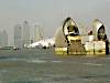 Die 520 Meter breite Barriere mit den zehn silbernen Toren ( die Tore haben übrigens eine gewisse Ähnlichkeit mit dem Opernhaus in Sydney ! ) schließen sich, wenn der Wasserstand eine bestimmte Höhe erreicht hat.