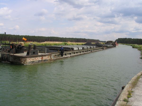 Polnischer Schubverband mit BIZON-Schuber auf dem Weg Richtung Berlin. Der Schubverband hat Kohle geladen, ein typisches Massengut.