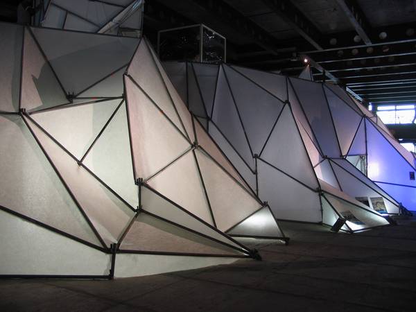 Der Berg ist eine Kombination aus Baugerüsten und Geotextil, daß sonst im Erd- und Grundbau eingesetzt wird.