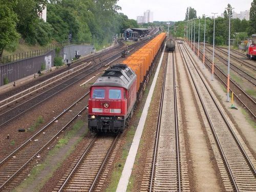 im Güterbahnhof Berlin Neuköln mit einem Müllganzzug.