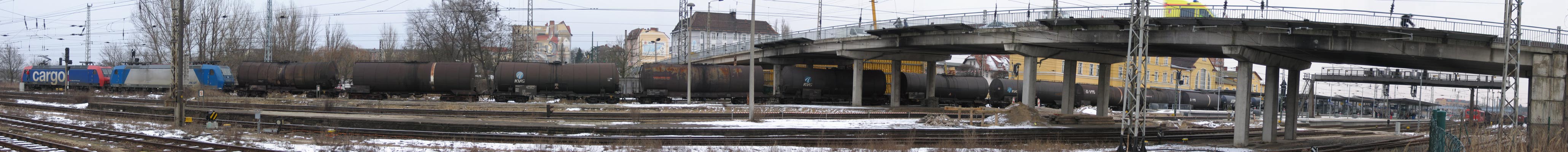 22.02.2005 Ein Güterzug nach Schwedt/Oder gezogen von zwei Elektroloks (Re 481 005-7 SBB Cargo und 185 524-4 der CFL) der neuesten Generation wartet unterhalb der Brückenbaustelle in Eberswalde auf die Weiterfahrt.