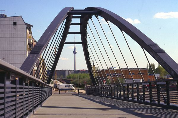 Die Fußgängerbrücke überspannt die umfangreichen Gleisanlagen im Bereich zwischen Schönhauser Allee, Bornholmer Straße und Gesundbrunnen. Die Brücke wurde Mitte der 90er gebaut.