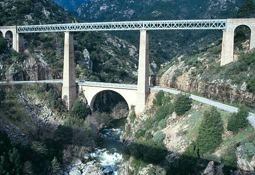 Eisenbahnbrücke (erbaut durch G. Eiffel) und alte Straßenbrücke an Pt. Du Vecchio (Korsica) April 2003
