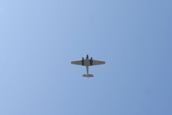 Eine Junkers-Verkehrsmaschine beim Flug über Berlin Kreuzberg.