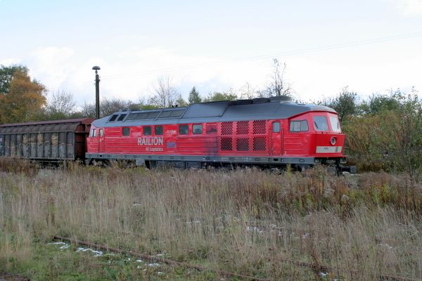232 675-9 wartet mit einem Güterzug auf Ausfahrt.
