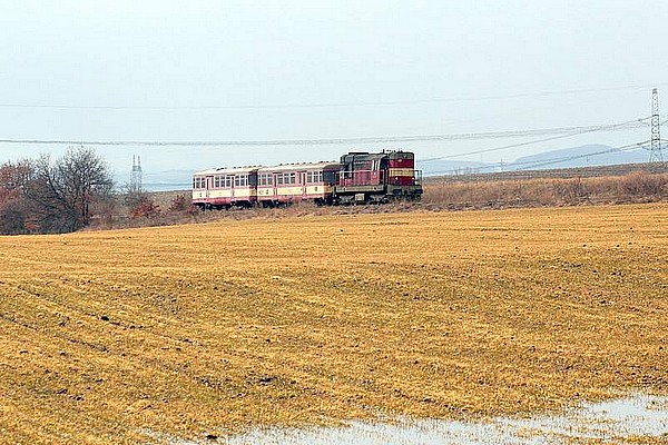 zieht einen kurzen personenzug auf dem weg von plzen nach zatec, hier kurz vor dem bahnhof von zabokliky
