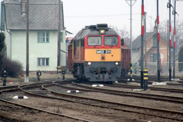 Eine weitere Taigatrommel, die ich in Betrieb sehen kann. Mit einem langen Zug offener Wagen beladen mit Holz durchfährt sie den Bahnhof von Papa