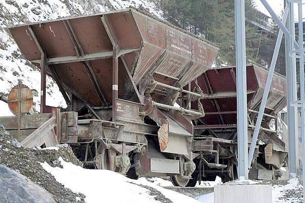 zwei alte Schüttgutwagen stehen etwas abseits.