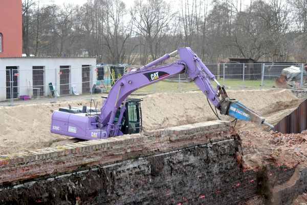 Ein Bagger reißt mit einem Abrißhammer die nicht mehr standsichere Schleusenwand ein.