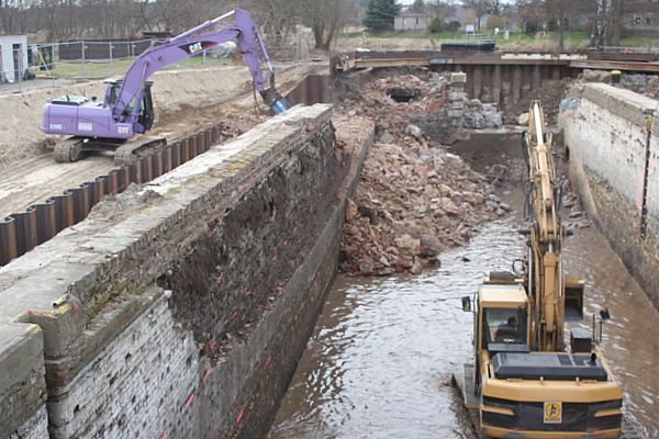 Mit einem zweiten Bagger wird der Schutt weg bewegt.