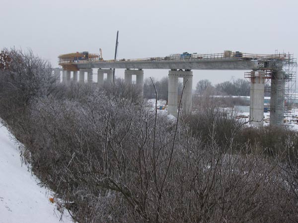 Im Bereich von Dänholm verliert die Brücke an Höhe. Hier wird sie auch nicht mehr aus Stahl sondern mit einer wandernden Schalung aus Ortbeton hergestellt.