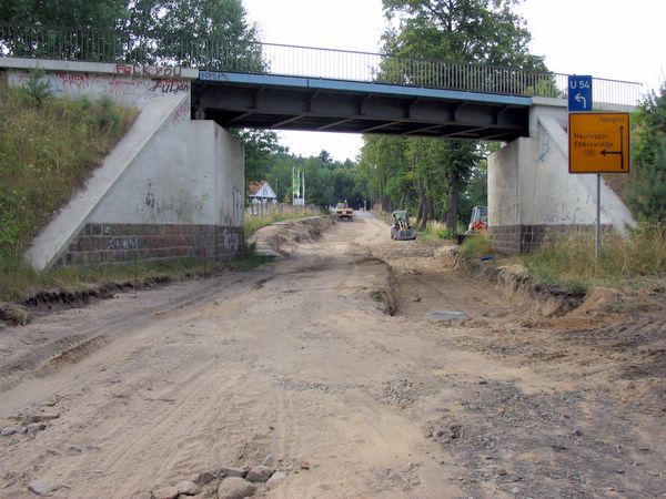 auch hier wird die Ortsdurchfahrt erneuert, über die Brücke fahren die Züge der Bahnlinie Eberswalde-Templin, die Joachimsthal an die große Welt anschließt