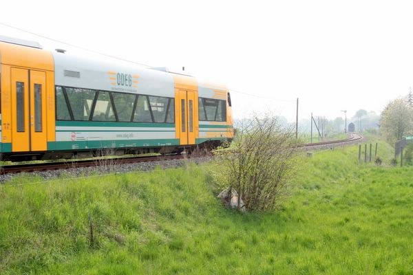 VT 650.66 (Regioshuttle der ODEG) bei der Einfahrt in den Bahnhof Joachimsthal.