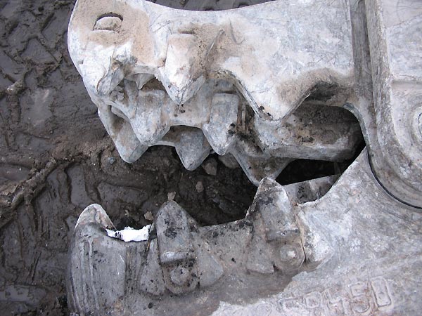 Sind die Dinosaurier zurück? Im Bereich des Flugplatz Finow wird ein Güterschuppen abgerissen. Das Bild zeigt die Abrißzange des Baggers.
