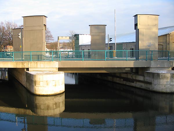 Unmittelbar neben dem alten Walzwerk überspannt die Hubbrücke den Finowkanal.