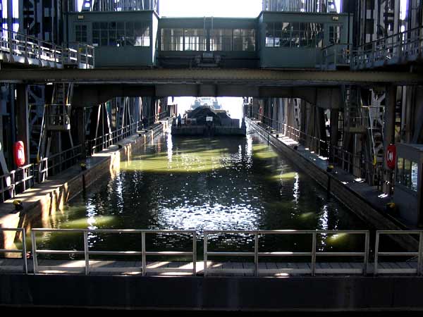 Ein polnischer Schubverband fährt von der Oderhaltung der Havel-Oder-Wasserstraße in den Trog des Schiffshebewerkes Niederfinow.