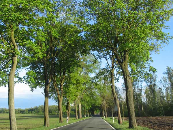 Es wird wirklich Frühling. Das Bild zeigt die Allee der B 198 zwischen Eichhorst und der Kaiserwegbrücke, nördlich der Ortslage von Finowfurt. Die Region ist Teil des Biosphärenreservates Schorfheide-Chorin.