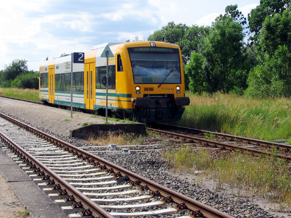 Triebwagen der ODEG bei der Ausfahrt aus dem Bahnhof Niederfinow.