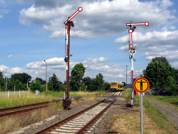 Auf der Eberswalde-Frankfurter Bahn sind noch Formsignale mit Seilzugantrieb in Betrieb, während ein großer Teil der Schranken bereits durch Motoren angetrieben wird.
