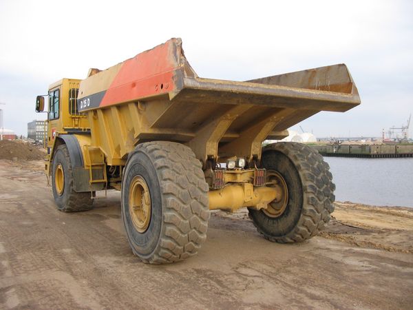 Ein zweiachsiger Dumper D 25 der Firma Caterpillar, der für den schweren Erdtransport entwickelt wurde. Eine Straßenzulassung haben solche Fahrzeuge nicht.