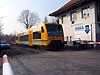 Triebwagen der ODEG bei der Ausfahrt aus dem Bahnhof Niederfinow.