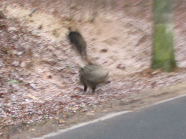 In wilder Panik stieben sie vor mir her und überqueren dann die Straße, ehe sie nach links im Wald verschwinden. Ein entgegen kommendes Auto konnte gerade noch so bremsen ...