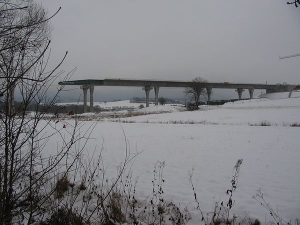 Baustelle zwischen Eisfeld und Schleusingen - die Brücke wird am östlichen Ende gefertigt und dann frei vorgeschoben. Dabei ist der Schnabel zu erkennen, der zu große Belastungen der Konstruktion verhindert, wenn die Mitte zwischen zwei Pfeiler überschritten ist.