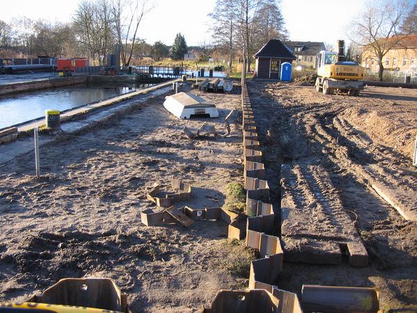 Die ersten Arbeiten an der Schleuse Schöpfurt haben begonnen. Der nördliche Teil der Umfassungsspundwand ist fertig gestellt. In ihrem Schutz werden die weiteren Arbeiten durchgeführt.