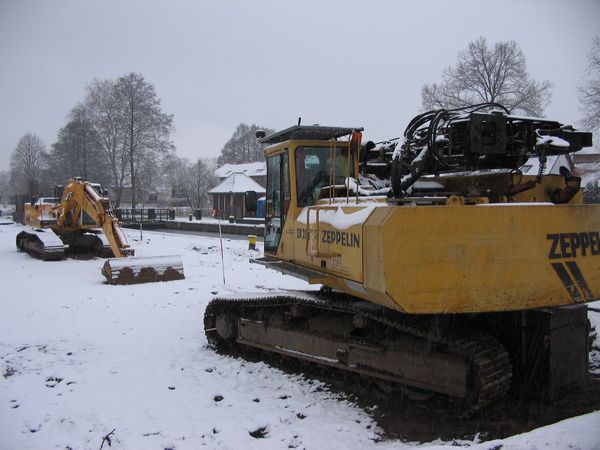 Zwei Bagger, der hintere hat mit seiner Grabenrämschaufel das Gelände vom Mutterboden befreit, der Vordere hat die Spundwand auf der Nordseite gerammt.