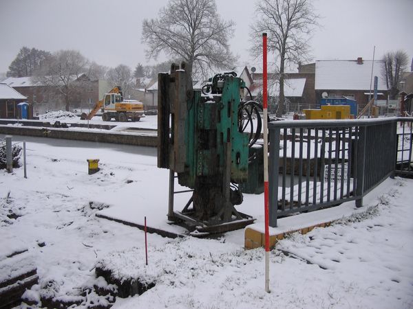 Die Baustelle liegt jetzt im Winterschlaf, hier ist der Rammbär zum Einbringen der Spundwand zu erkennen.