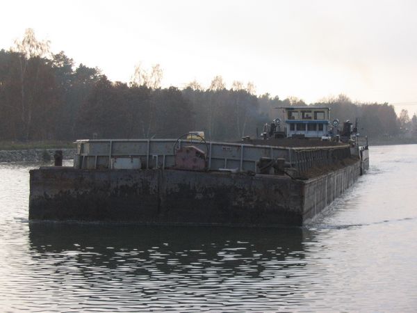 polnischer Schubverband, der im Zusammenhang mit dem Ausbau des Kanals Baustellentransporte durchführt.