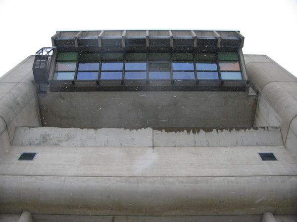 Steuerstand der Schleuse Uelzen 1. Durch die vielen Glasfläschen wirkt er so, als würde er hier garnicht hingehören zwischen all diesen technischen Beton.