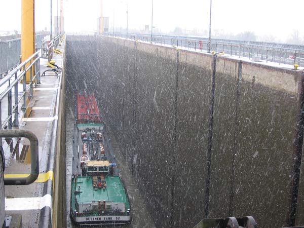 Als ich an der Schleuse war, herrschte gerade heftiges Schneetreiben. Trotz des Winters herrscht aber weiter starker Verkehr auf dem Elbe-Seitenkanal. Jeweils oben und unten warteten einige Schiffe auf die Passage, während hier ein Koppelverband der Dettmer-Tankreederei geschleust wird.