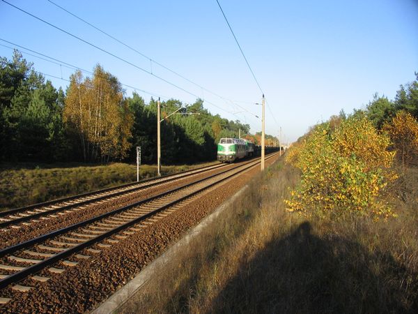 Die Lok 118 003 der ITL zieht zusammen mit einer Taigatrommel der ITL einen Zug mit Schüttgutwagen aus dem Bahnhof Eberswalde Richtung Süden.