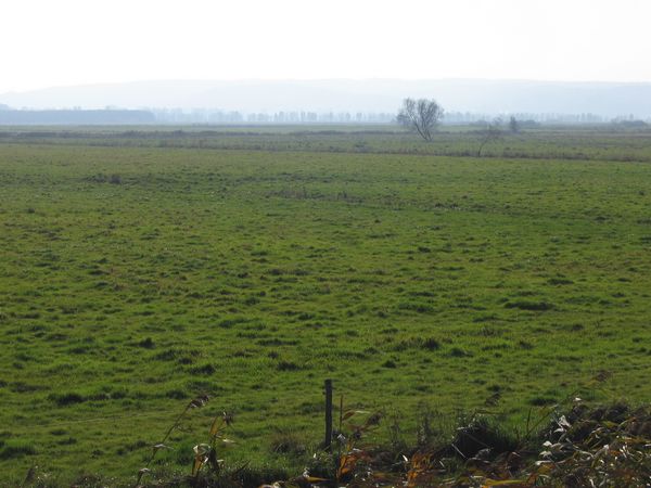Blick vom Finowkanal Richtung Südost, entfernt im Dunst ist die Hochfläche des Barnims zu erkennen, die in der Gegend von Falkenberg sehr steil zum Oderbruch abfällt.