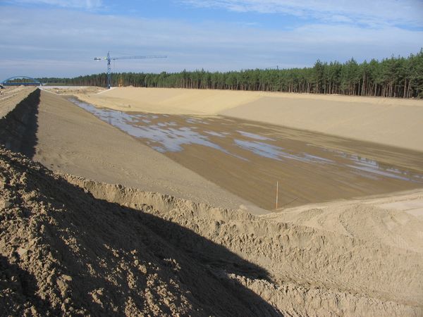 Um ein Austrocknen der bereits eingebauten Tondichtung zu verhindern, muß die Fläche feucht gehalten werden.
