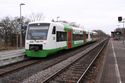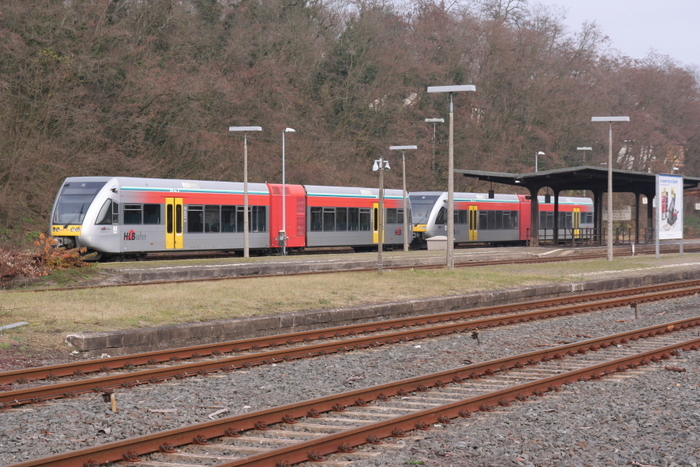 Zugbegegnung von Triebwagen der BR612 und VT 023 und VT 020 der Erfurter Industriebahn im Bahnhof Ebenhausen, im Bahnhof Ebenhausen wird das Triebwagendoppel getrennt und der erste Triebwagen macht sich auf den Weg nach Bad Kissingen und Bad Neustadt