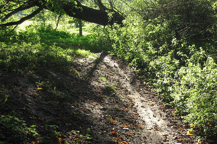 Am Westende des Großen Buckowsees versperrt ein umgestürzter Baum den sonst benutzten Weg, die Umleitung ist aber schon getrampelt.