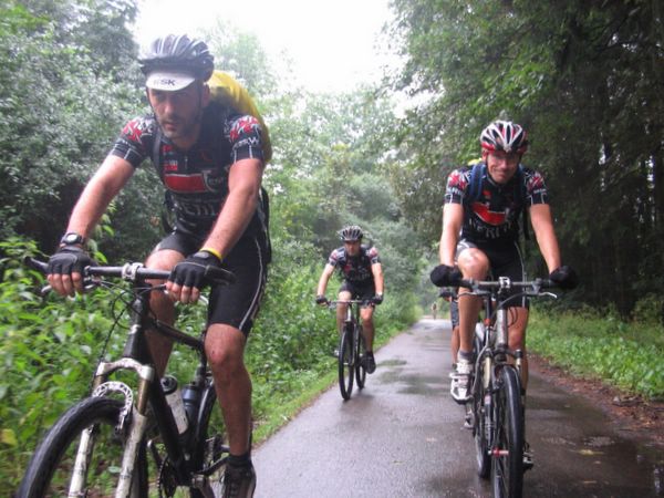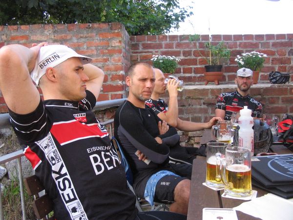 Der Morgen in Berlin verheißt erstmal nichts gutes, denn als ich ca. 40 min vor der entscheidenden Zeit am Gesundbrunnen eintreffe, verdichten sich die bis dahin nur mittelgrauen Wolken noch weiter und spucken urplötzlich Unmengen an Wasser aus, so daß meine Lust auf eine 150-km Tour mit diesen Verrückten mächtig sinkt!