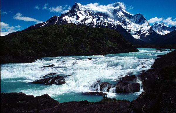 Das Wasser des Lago Nordenskjöld fließt durch Salto Grande in den Lago Pehoe, dahinter die Cerro Paine Grande