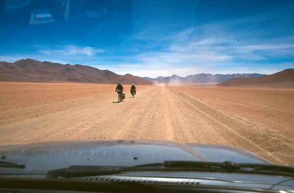Das erstaunliche passiert, in dieser eigentlich so garnicht einladenden, weil trockenen und staubigen Gegend, kommt uns ein Radfahrerpaar entgegen. Langsam aber konstant schaukeln sie über die ausgefahrene Piste, einer hat einen schwer beladenen Anhänger. Und in mir wächst der Wunsch, es ihnen gleich zu tun und auch diese Gegend zu durchqueren. Bei entsprechender Vorbereitung sicherlich ein großes, wenn auch anstrengendes Erlebnis.