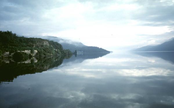 Mitten in der Nacht hört der Regen plötzlich auf und ich werde wach davon. Bis zum Morgen klart es auf. Das Zelt ist noch sehr feucht und so packe ich Innen- und Außenzelt getrennt ein. Die zwei Kilometer bis Fort Augusta sind schnell überwunden. Zuerst passiere ich die Treppenschleuse ( sechs Stufen ) und folge dann dem Kanal bis zum Loch Ness. Das Loch zeigt sich noch in Morgenstimmung. Die Sonne verbirgt sich hinter den tief stehenden Wolken und spiegelt sich nur kurz im ruhigen Wasser des Sees.