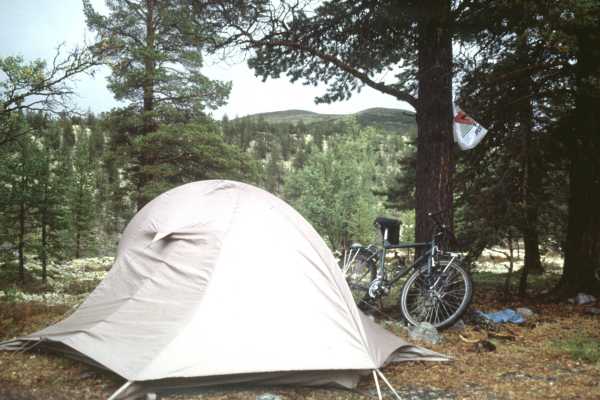 In strömendem Regen bin ich wieder aufgebrochen und habe mich recht früh verfahren, so daß ich jetzt eine Straße weiter südlich bin als geplant. Nach 40 km hatte ich um 16.00 die Schnauze voll, es regnete noch immer und das 24er wollte die Kette an einer Steigung nicht bewegen, so daß ich sie nicht schaffte. Also drehte ich um und baute am Beginn des Anstiegs das Zelt auf.