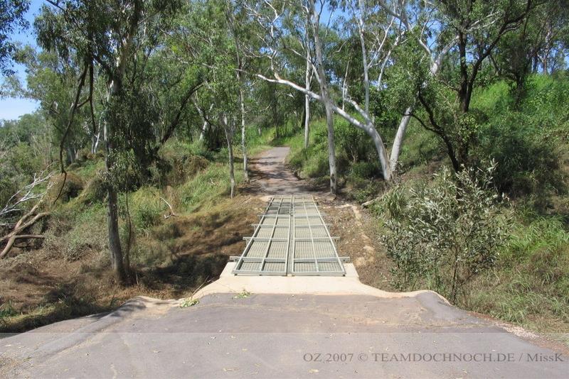 Also kehren wir um, fahren bis zur Railwaybridge zurück und dann am Südufer entlang. Der Weg hier führt direkt am Stadtrand entlang, denn nördlich des Flusses befinden sich nur einzelne Häuser. Der Unterschied wird auch durch die Vegetation deutlich, im Norden war der Weg von mannshohem Gras begrenzt, hier ist dagegen alles frisch gemäht. Wir kommen an der Hot Spring vorbei, aber auch hier ist alles geschlossen wegen der noch andauernden Wet Season.