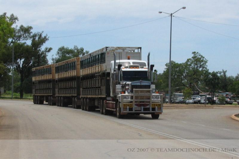 Auf der weiteren Fahrt passiert wieder relativ wenig. Es gibt keine Orte mehr bis Katherine und auch sehr wenige Abfahrten zu abgelegenen Stations. Dafür wird die Vegetation immer dichter und wir sehen auch wieder viele Termitenhaufen rechts und links. Rechtzeitig von Katherine kommt auch wieder unser Freund der Regenmann vorbei und so kommen wir gegen 19.00 Ortszeit frisch gewaschen in Katherine zum Tanken.