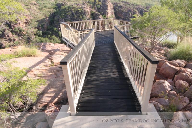 Wir sind zunächst unschlüssig, da aber alles am selben Standort beginnt, gehen wir erst einmal los. Der 1. Lookout ist relativ bald erreicht und endet auf einer Kuppe, auf der der Wind zum ersten mal richtig weht. Bis hier kann auch in jedem Fall gelaufen werden, der Rest wird allerdings gesperrt, sowie eine Temperatur von mehr als 36°C erwartet wird.