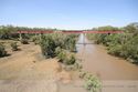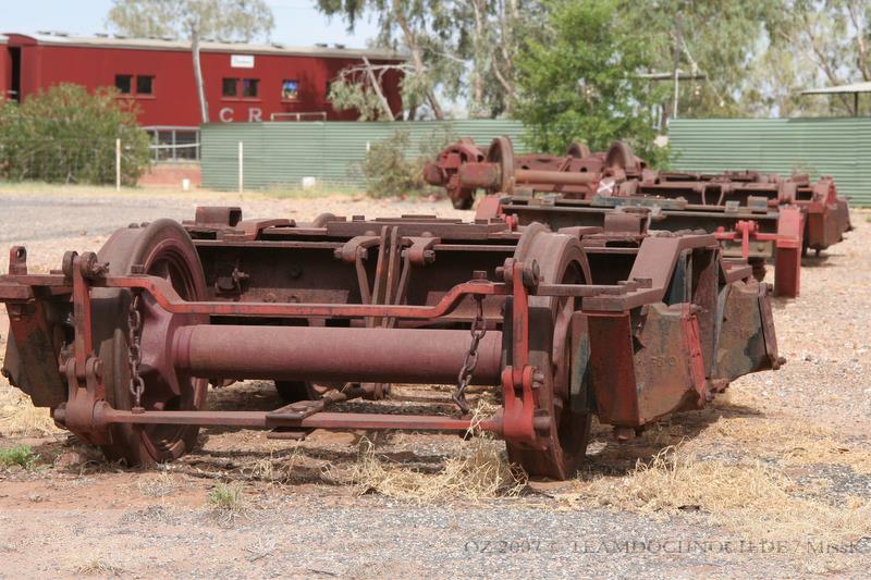 Durch einige Seitenstraßen und u.a. vorbei an einem Didgeridoo-Händler fahren wir nach Norden zum Flussufer und treffen hier auf die Straßen- und die alte Bahnbrücke, die direkt nebeneinander den Katherine überqueren. Als Erinnerung an die Bahnlinie, die hier früher entlang führte stehen eine alte Dampflok und zwei Flachwagen auf einem Gleisrest.