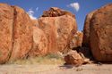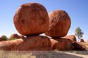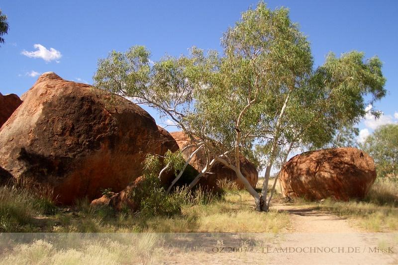 Bei den Devils Marbels haben wir anscheinend den heißesten Abschnitt des Tages erreicht - es herrschen ca. 44°C. Trotzdem laufen wir etwas draußen herum und bestaunen diese eigenartigen Murmeln, die nach Glauben der Aborigines die Eier der Riesenschlange sind.