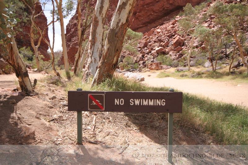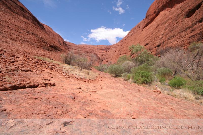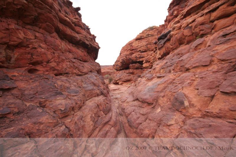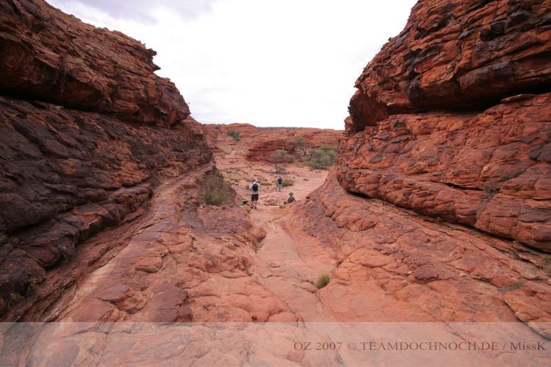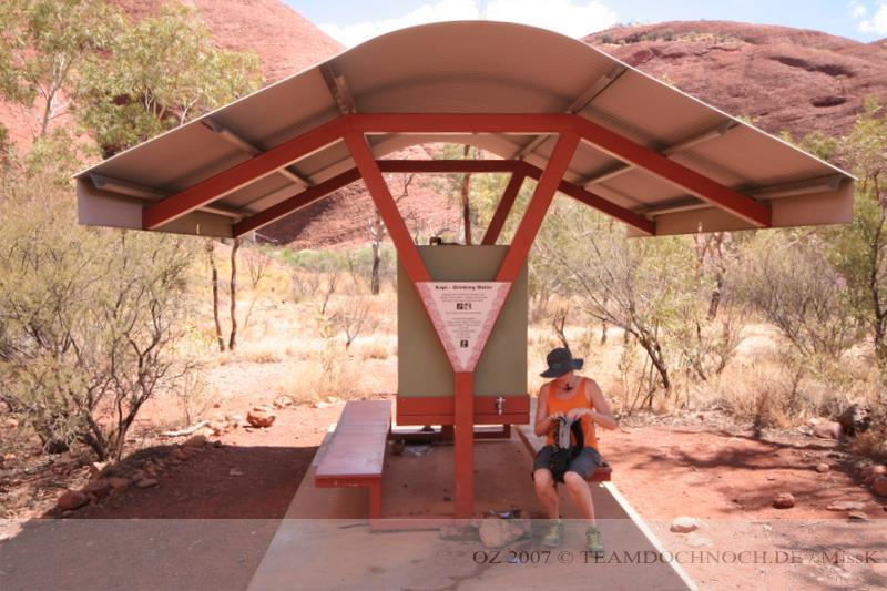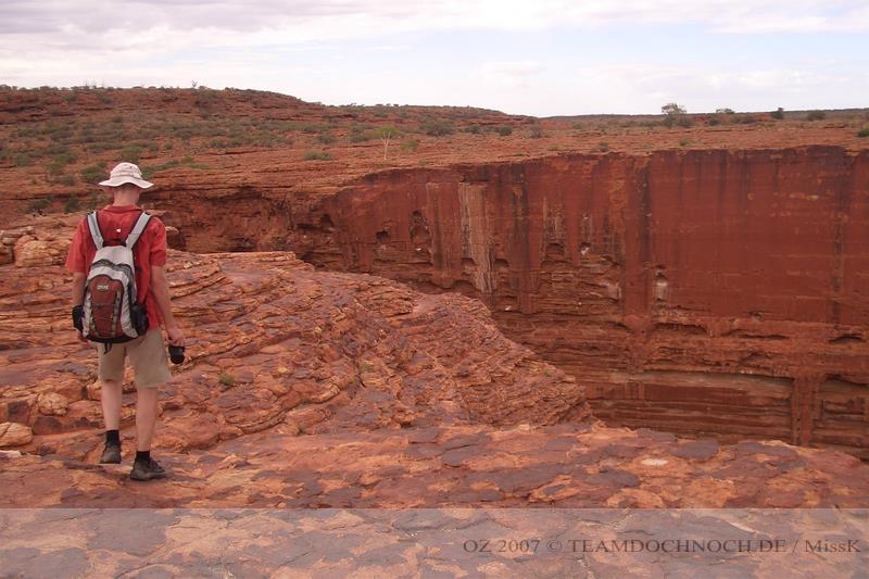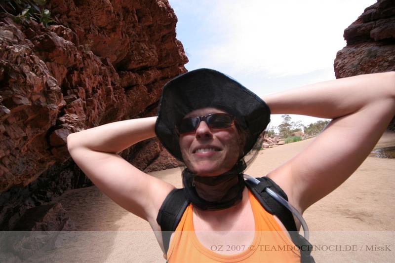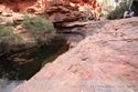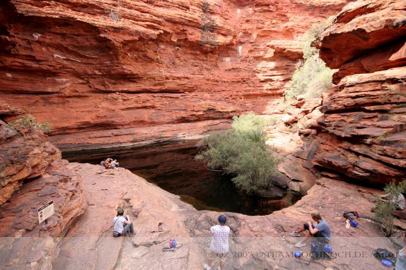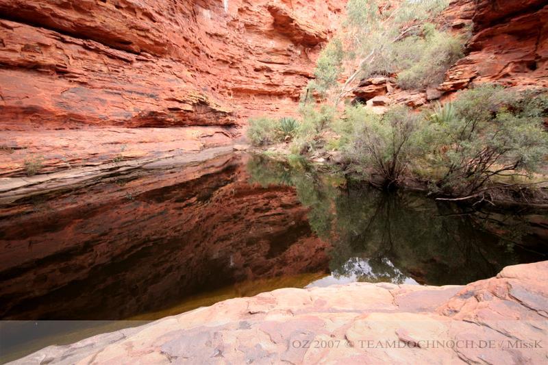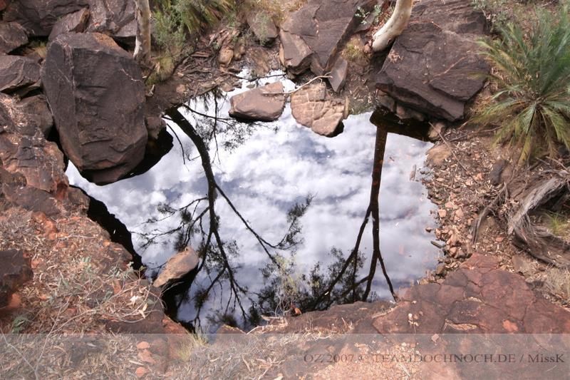 Wir hielten noch an den Kathleen Springs. Hier befindet sich am Ende eines Tales ein Wasserloch, dass von den Aborigines verehrt wird. Die Schlucht ist bei weitem nicht so beeindruckend wie der Canyon, entwickelt aber einen ganz eigenen Reiz, vielleicht auch, weil wir hier ganz allein sind.