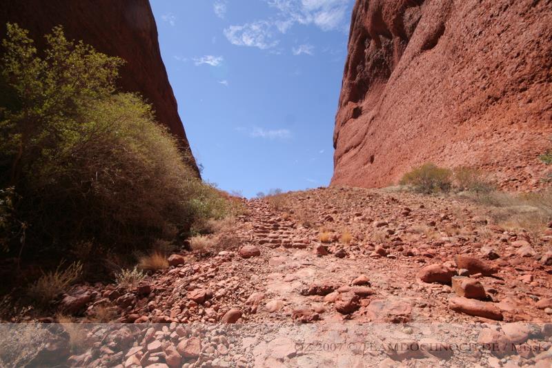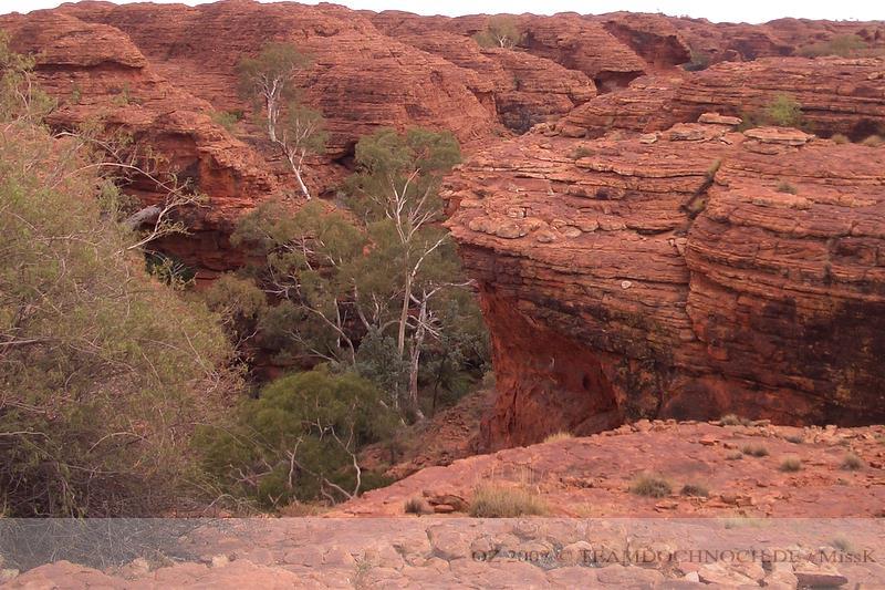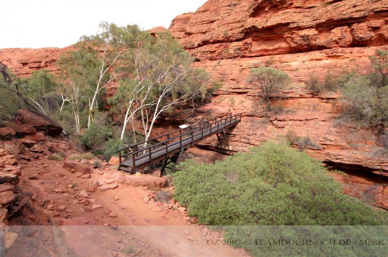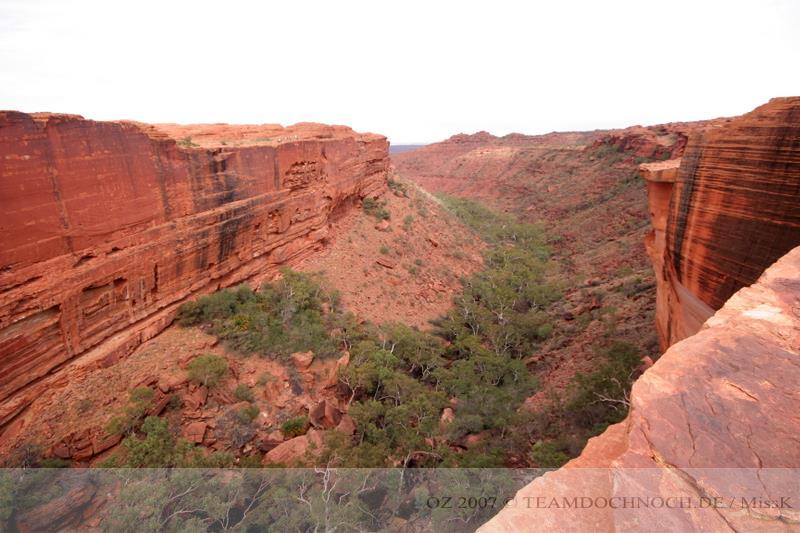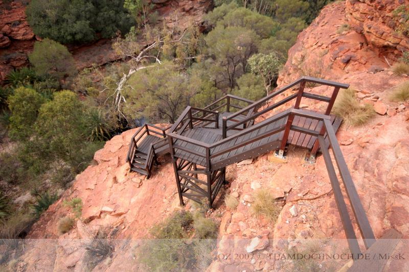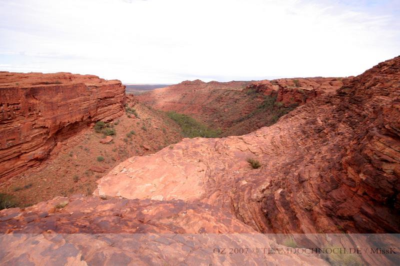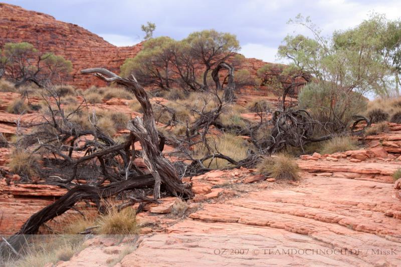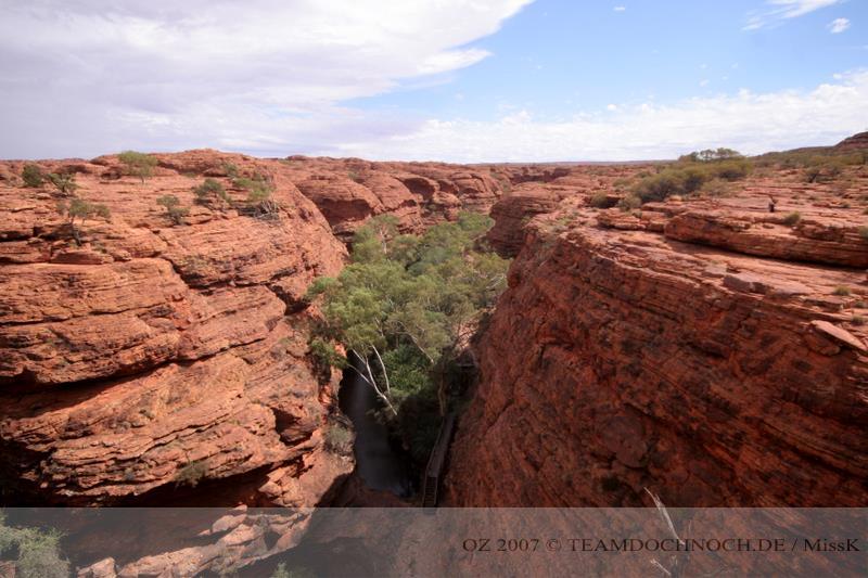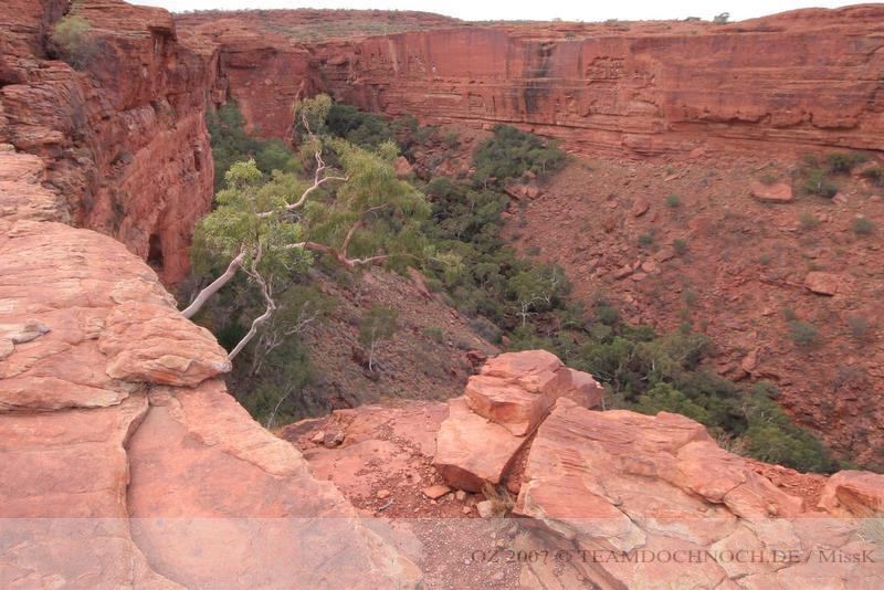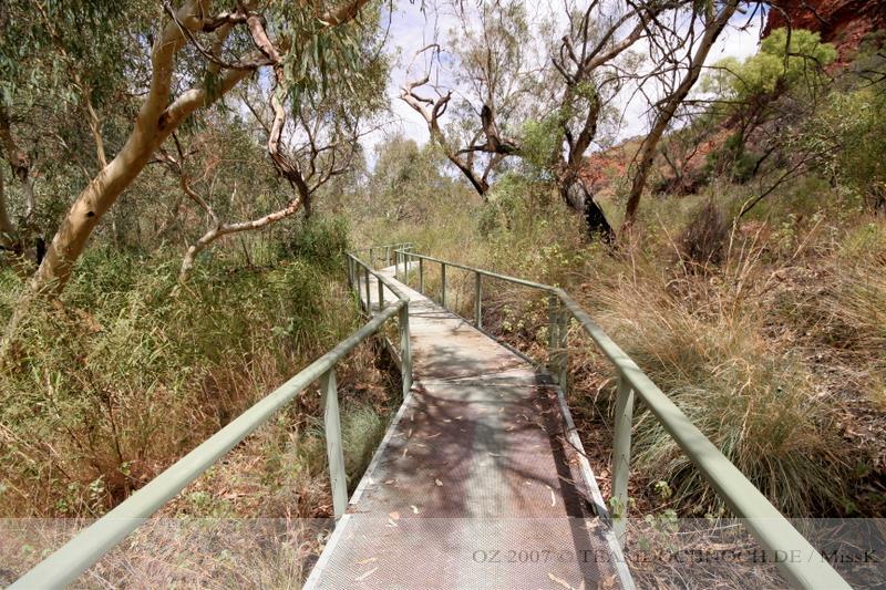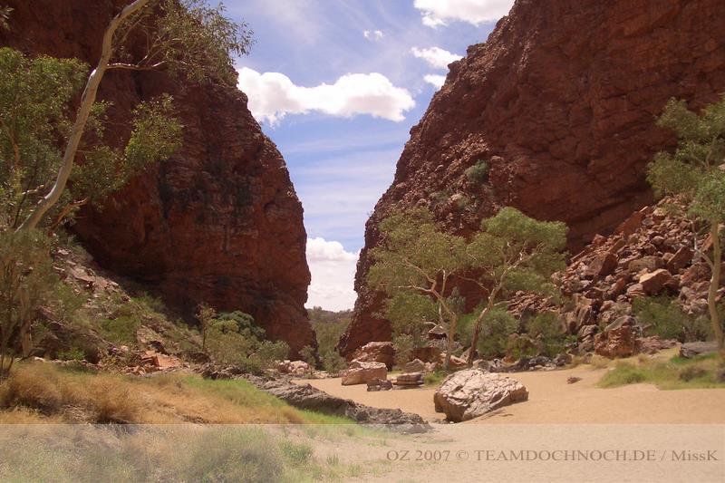 Wir hielten noch an den Kathleen Springs. Hier befindet sich am Ende eines Tales ein Wasserloch, dass von den Aborigines verehrt wird. Die Schlucht ist bei weitem nicht so beeindruckend wie der Canyon, entwickelt aber einen ganz eigenen Reiz, vielleicht auch, weil wir hier ganz allein sind.